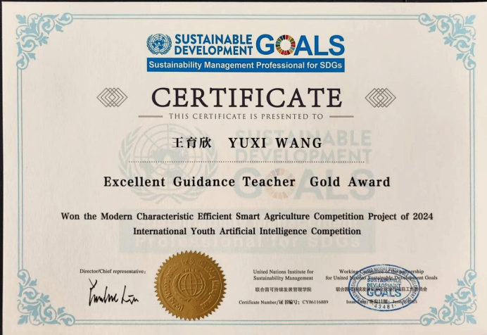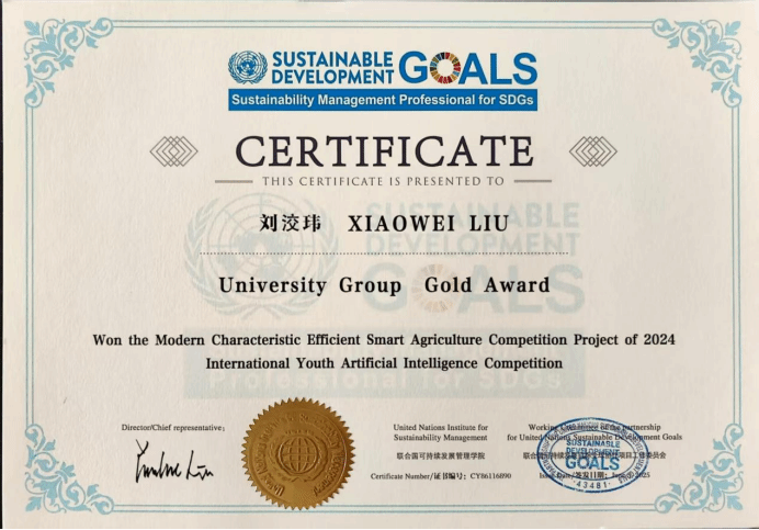 近期,我校收到联合国可持续发展管理学院(United Nations Institute for Sustainability Management)颁发的获奖证书,我校学生刘洨玮在2024年第六届国际青年人工智能大赛现代特色高效智慧农业赛道中荣获大学组金奖,指导教师王育欣荣获优秀指导教师奖。