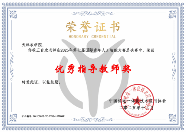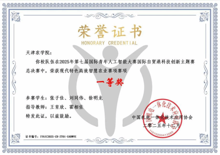 经层层选拔,中、英、爱等 6 国 17 所学校的 92 支团队晋级总决赛,大赛共评出一、二、三等奖 63 项。我院计算机与信息工程学院张子佳、刘同伟、徐明龙同学团队,在王育欣、霍相佐老师指导下,凭借《AI 赋能热带农产品质量安全检测与智能监控》项目,于 “现代特色高效智慧农业” 赛项中脱颖而出,斩获一等奖,两位指导老师获评优秀指导教师奖。