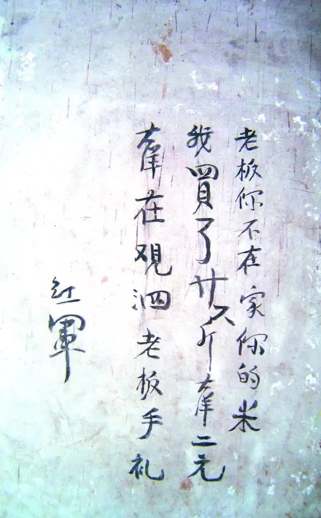 “老板:你不在家,你的米我买了廿六斤,大洋二元,大洋在观泗老板手礼(里)。红军”。在福建省漳平市杨美村传统民厝荣福堂内的墙壁上,一幅高0.55米、宽0.35米的留款信十分引人注目。