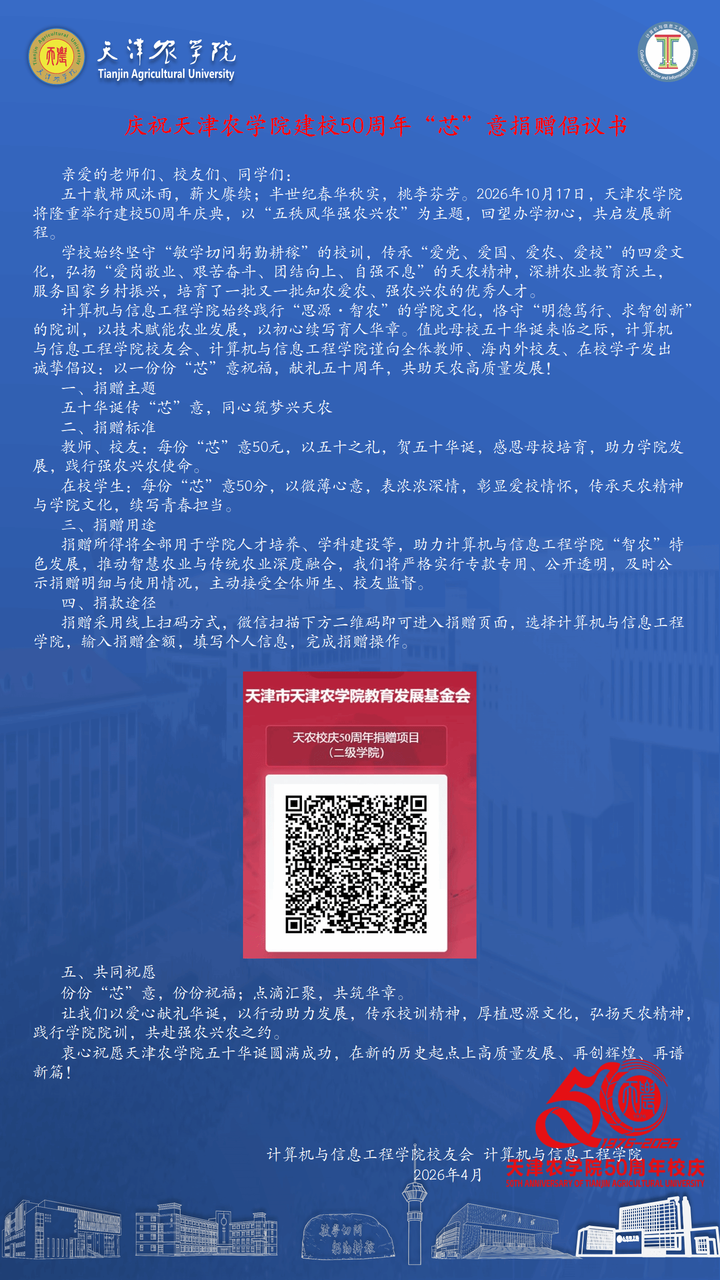 计算机与信息工程学院(校友会)庆祝天津农学院建校50周年“芯”意捐赠倡议书